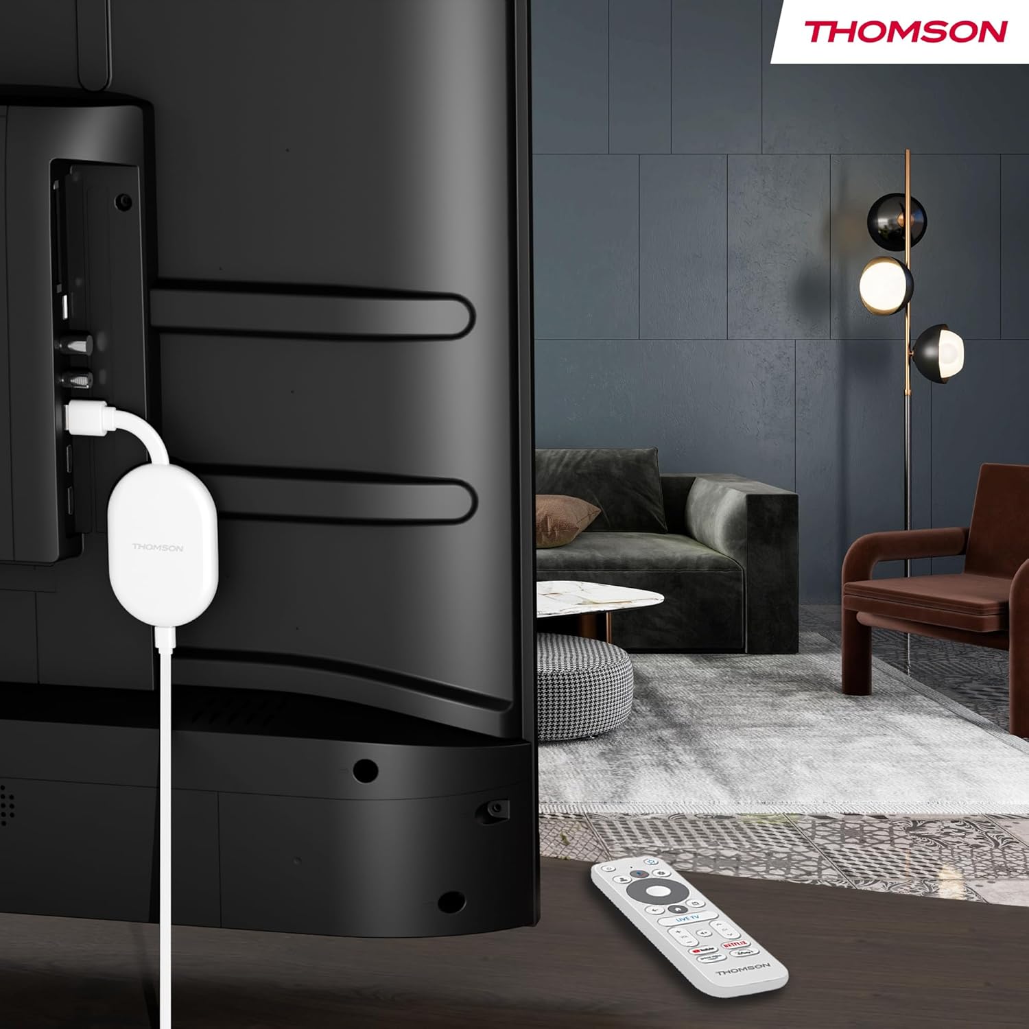 El THOMSON Go Cast 150 es un dongle de streaming 4K UHD con sistema operativo Google TV™ y funcionalidades de control por voz a través de Google Assistant y Google Cast integrado.