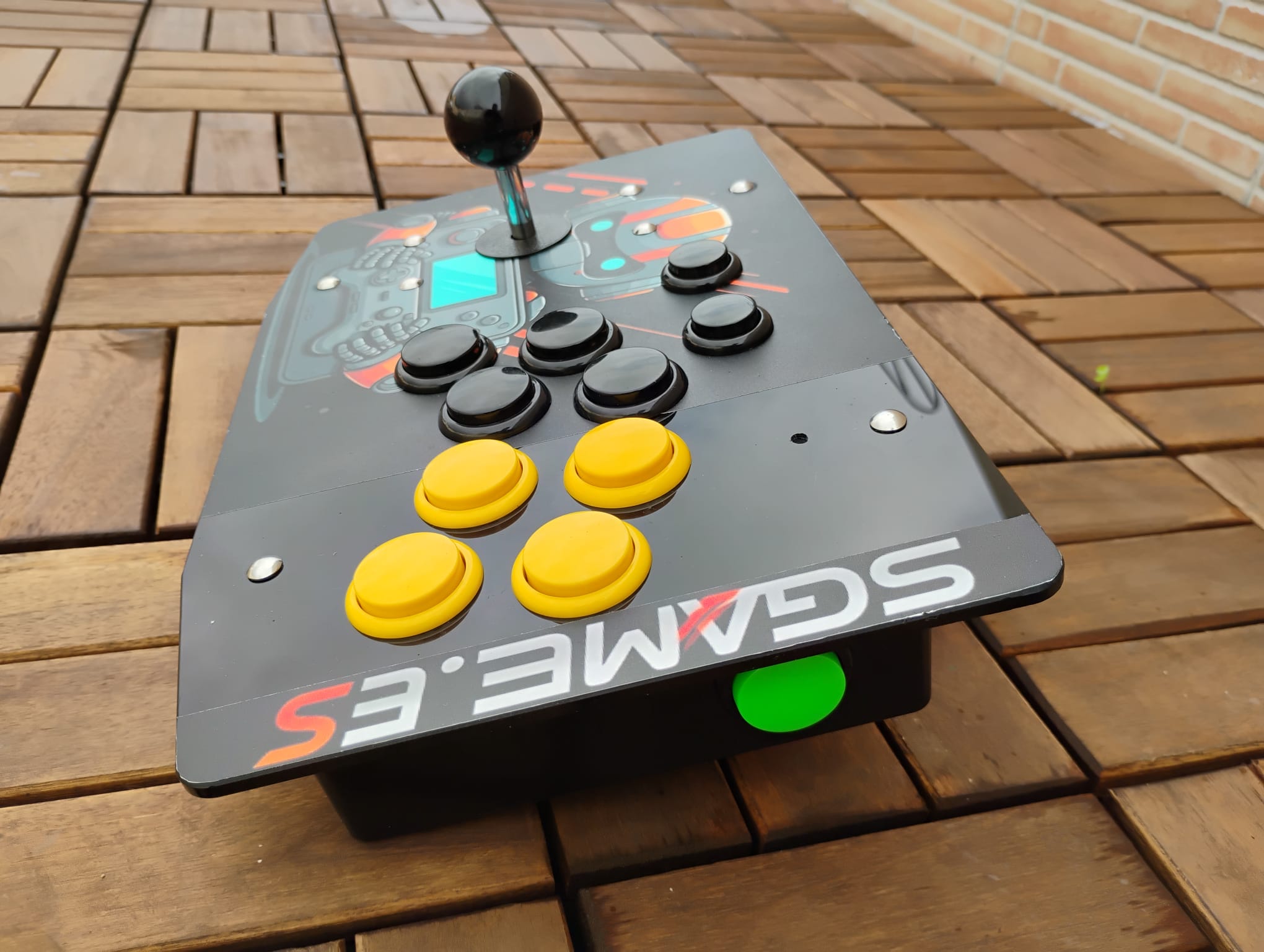 -11 botones de control redondos (los botones pueden ser de color distinto al de la foto dependiendo de la existencias y colores que tengamos disponibles. Algunos botones puede que no estén conectados, dependiendo de la configuración) + un joystick de esférico (Montado a mano)